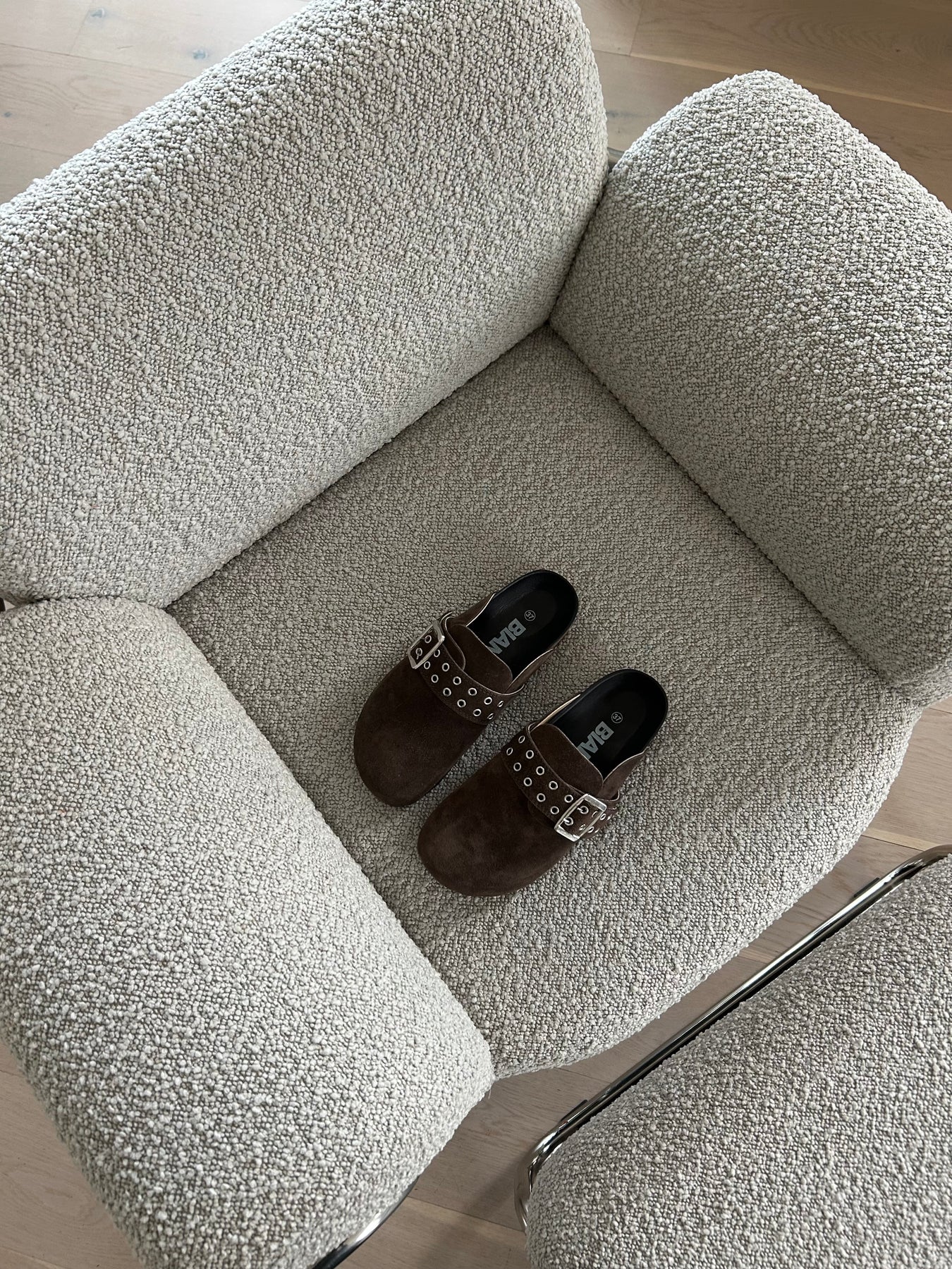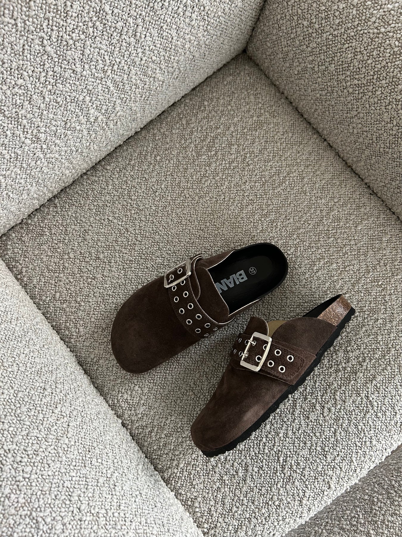 Semsket skinntøfler med spenne. Kul modell som passer til alt. Nydelig brunfarge.