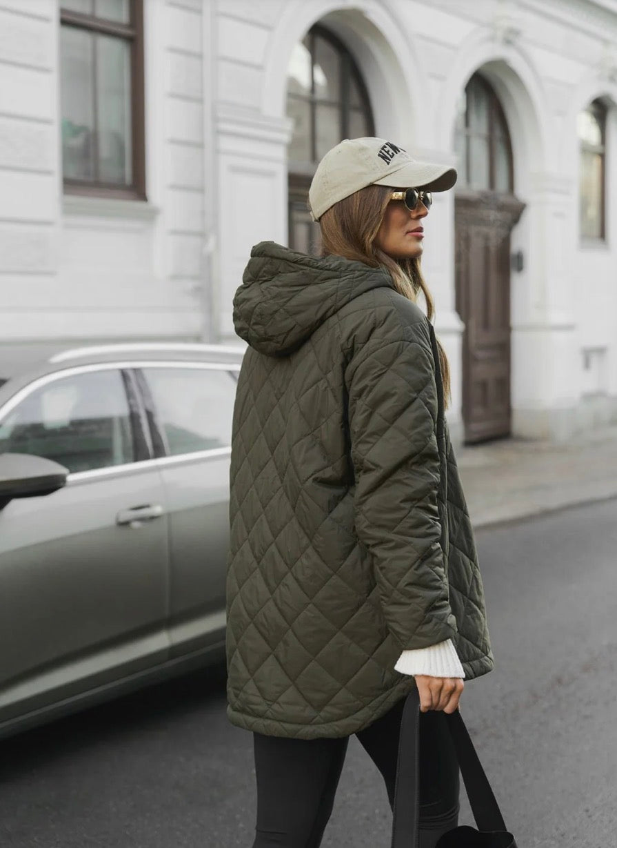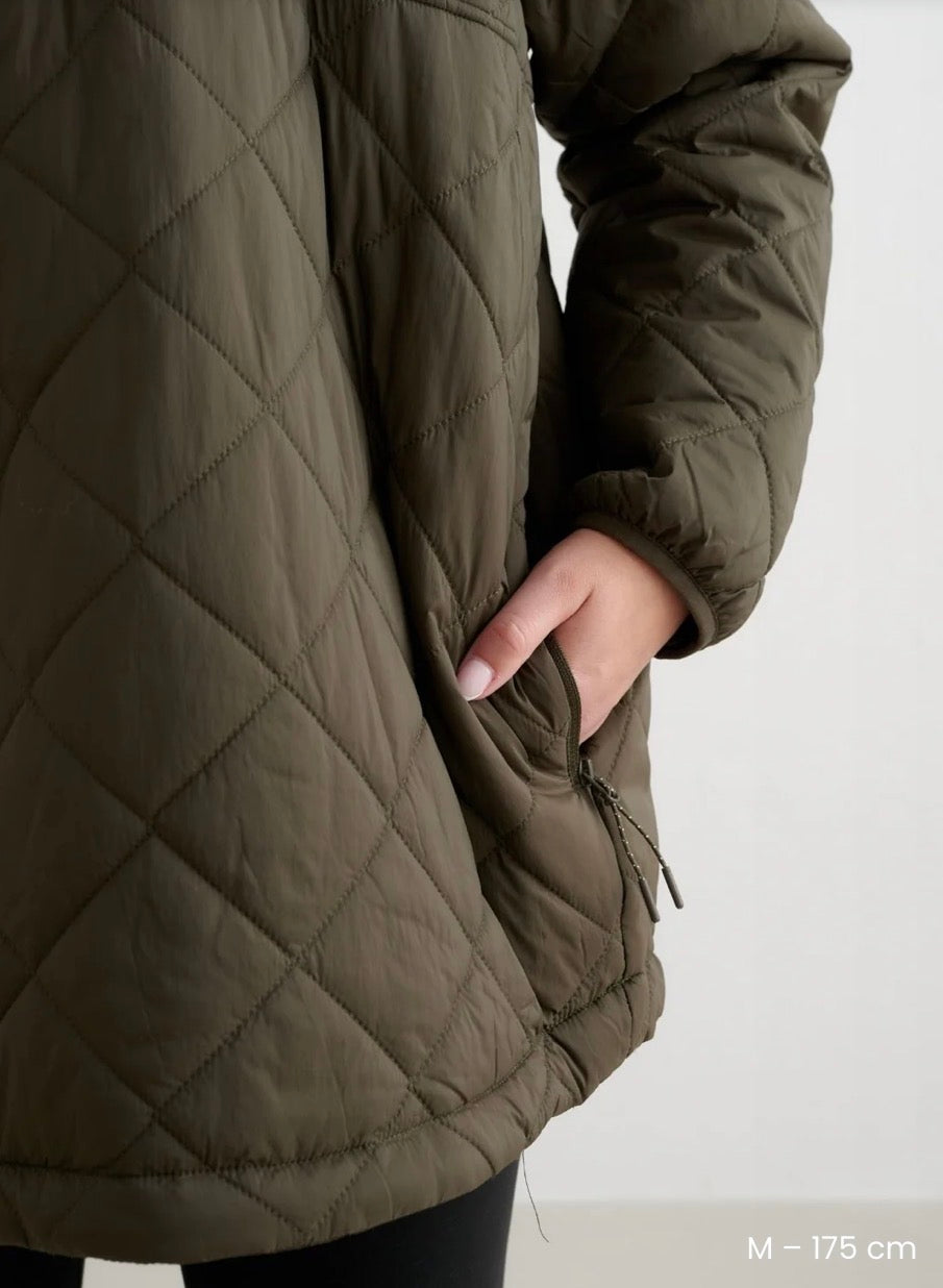 Quilted jakke med half zip og hette. Veldig lett og sporty modell som passer til hverdag eller til tur og treningsklær.