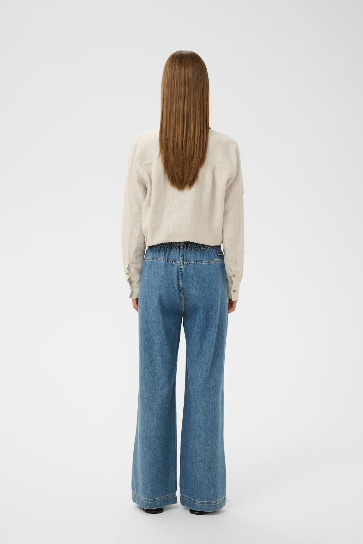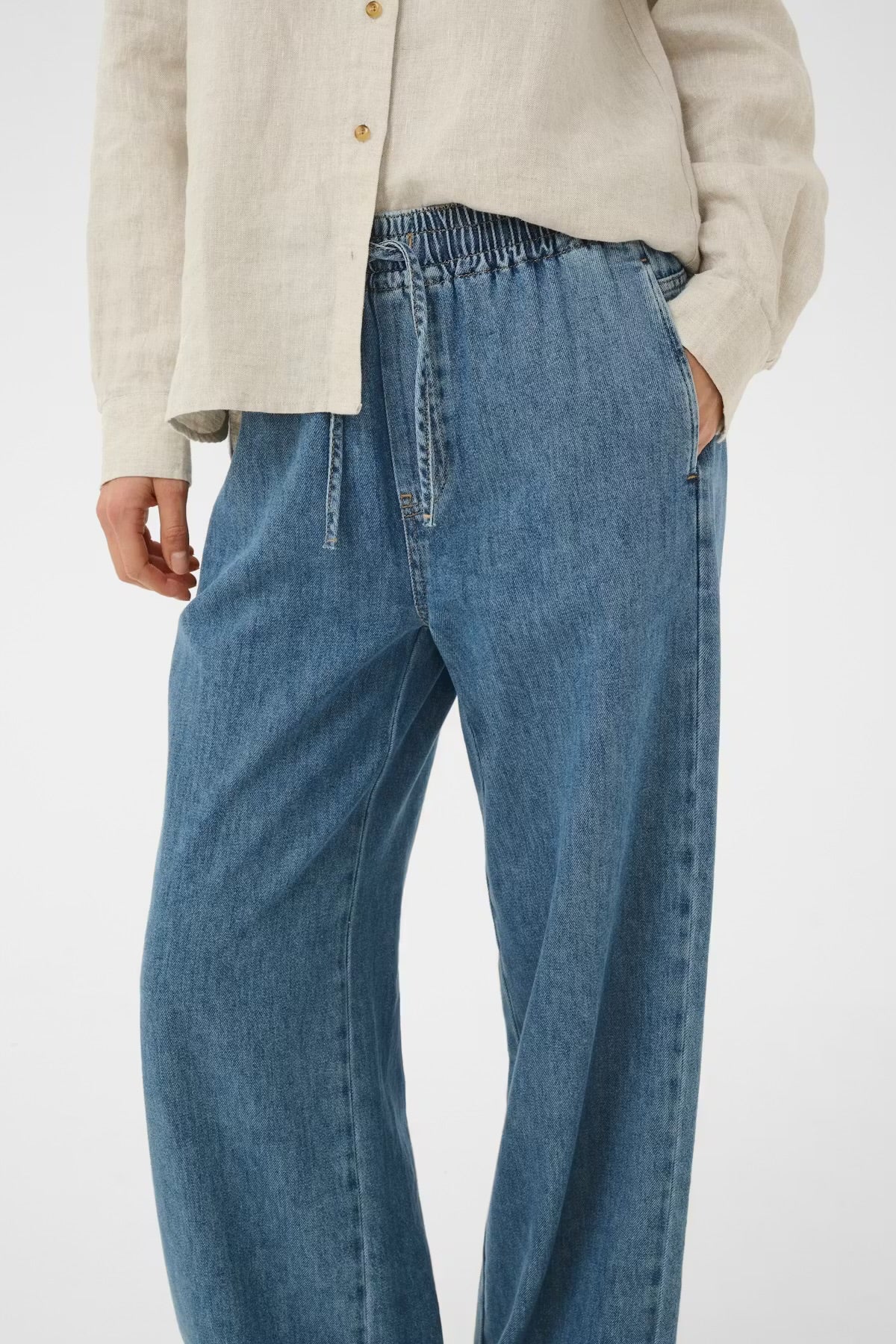 Vide denim-bukser med elastisk liv og snor, avslappet passform og full lengde. Enkel design med glatte flater og få synlige sømmer.
