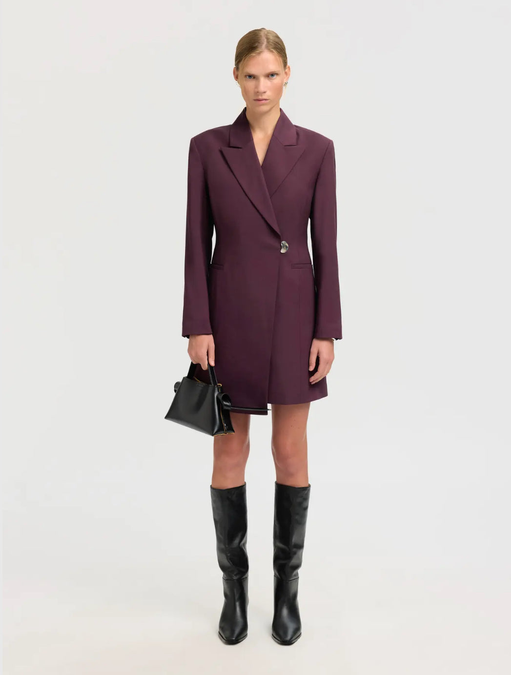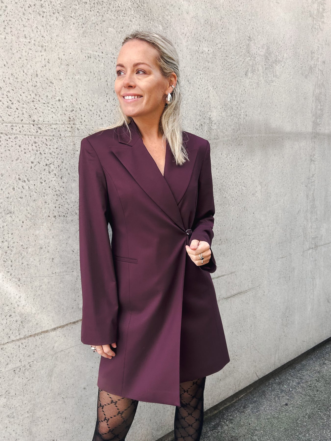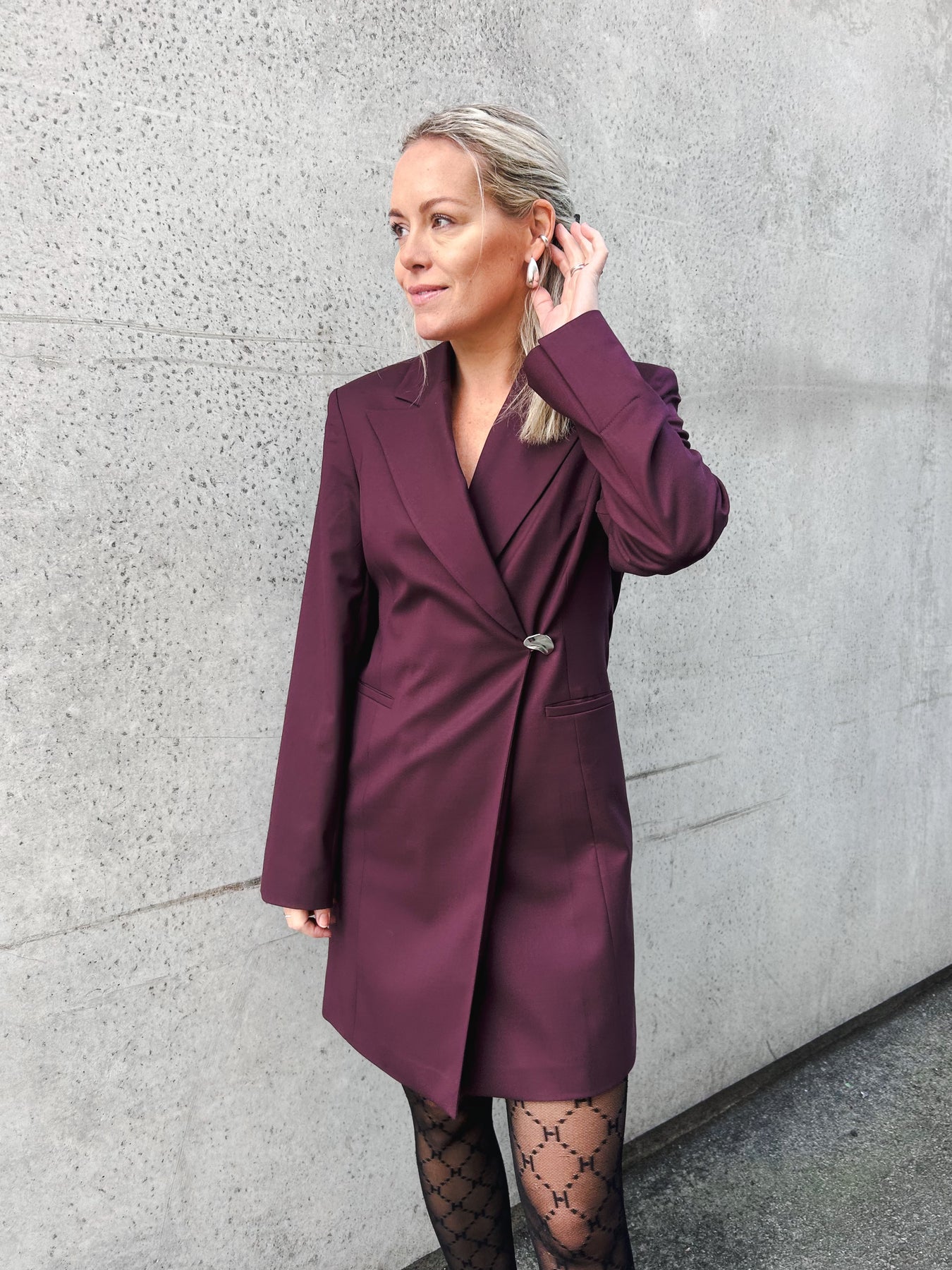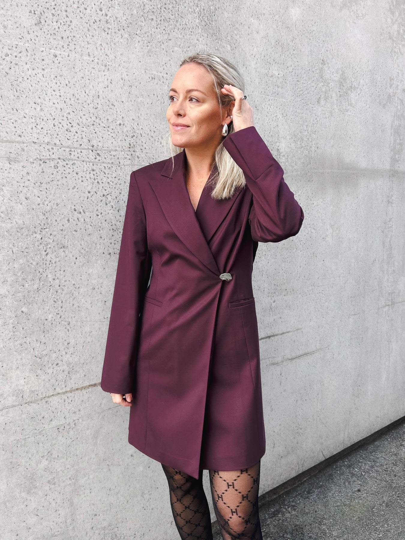 Blazerkjole i fin burgunder med skulderputer og innsvingt liv. Myk og lett kvalitet og deilig å ha på seg. Spenne i siden med organisk form i sølv. Kul og klassisk kjole som passer til både jobb og julebord.