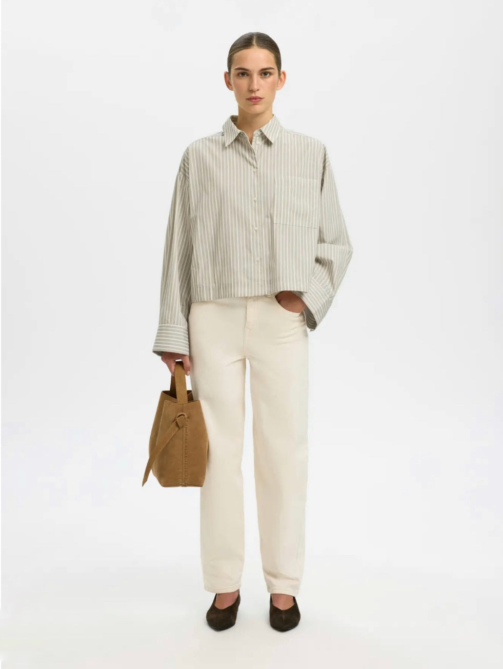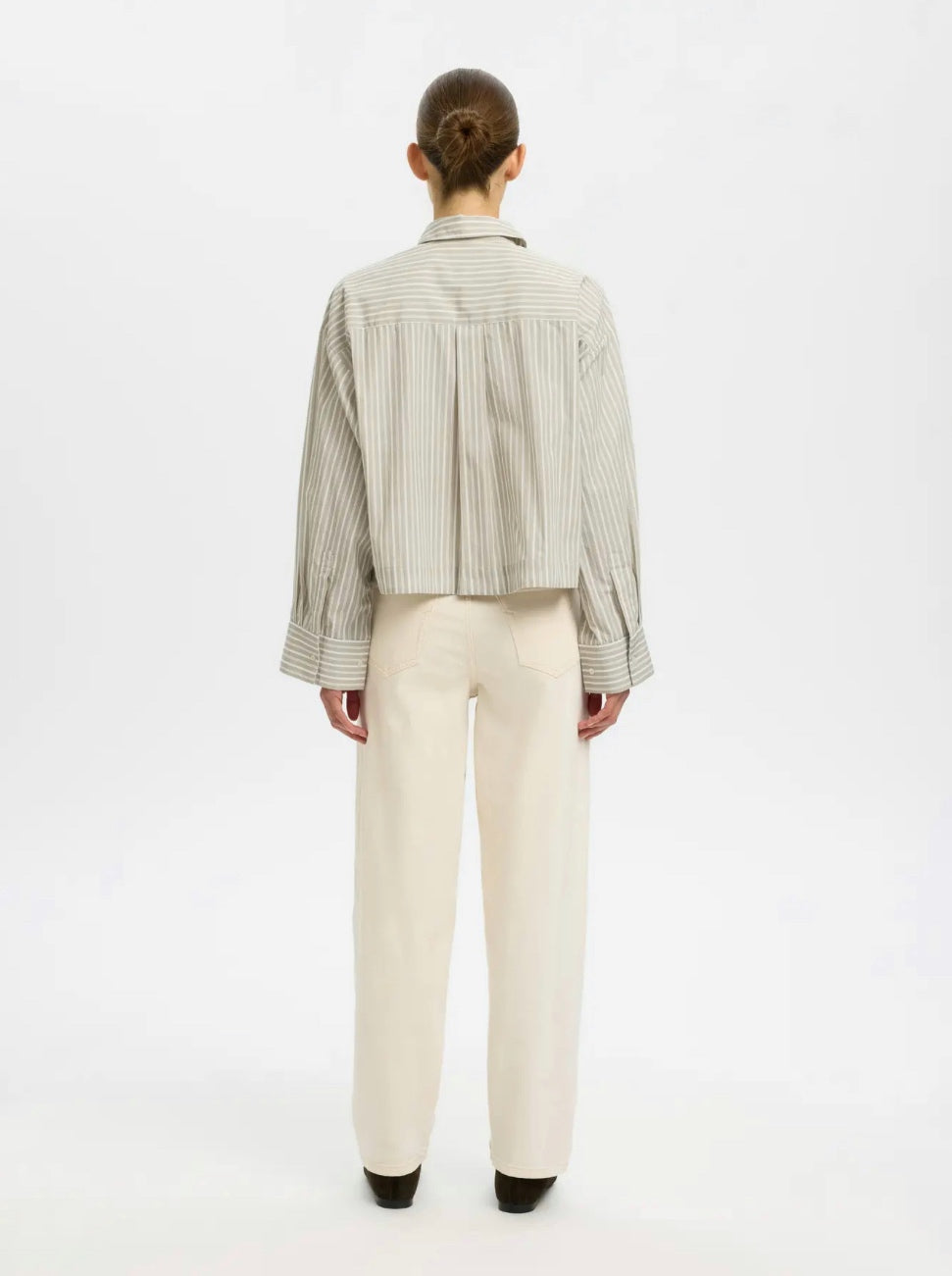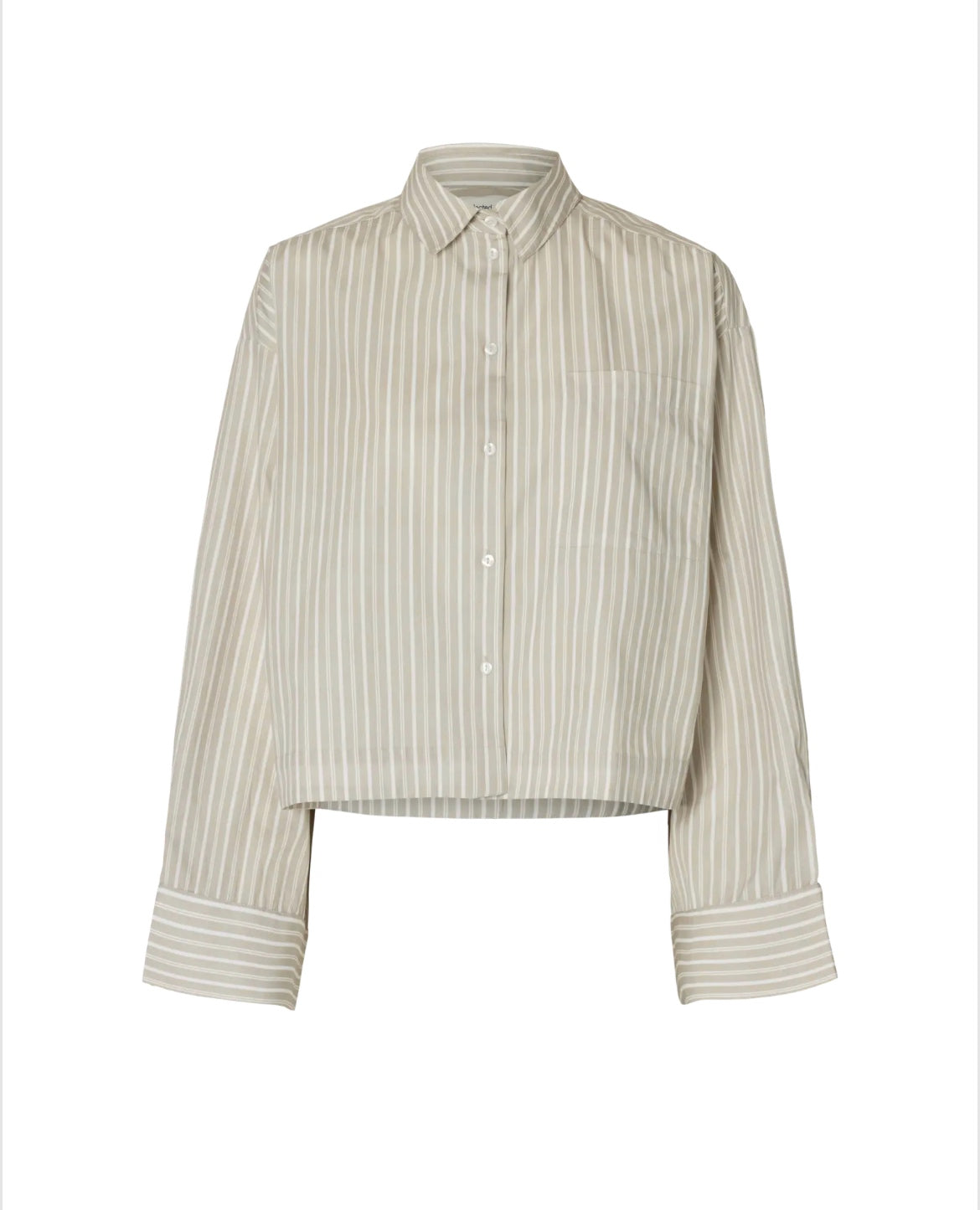 Stripete skjorte med cropped passform. Løs og lett med vide ermer. Kan styles til brunfarger eller hvit jeans og brune semskeskinnsko.