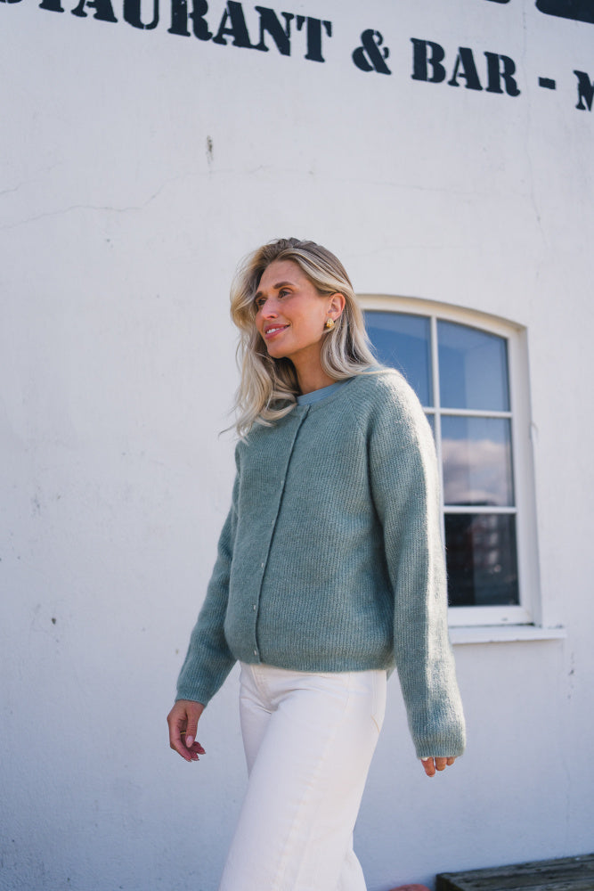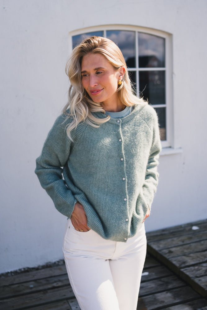 Deilig og myk cardigan i delikat grønnfarge. Rund hals og lange ermer, normal fasong. Perfekt over en kjole eller til jeans.