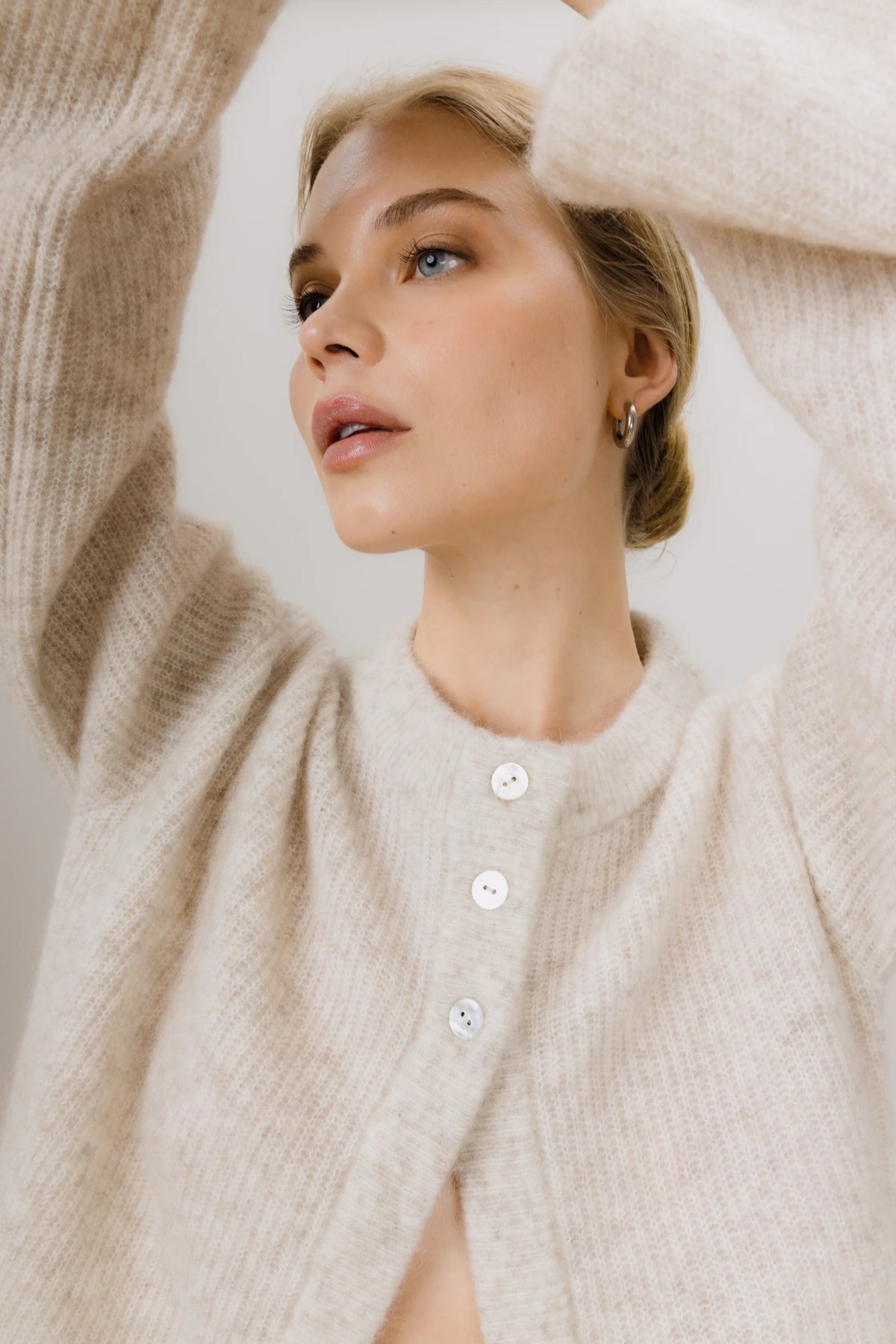 Nydelig strikkejakke fra Urban Pioneers. Kort modell med vide ermer. Knapping øverst. Kul modell som passer til alt.