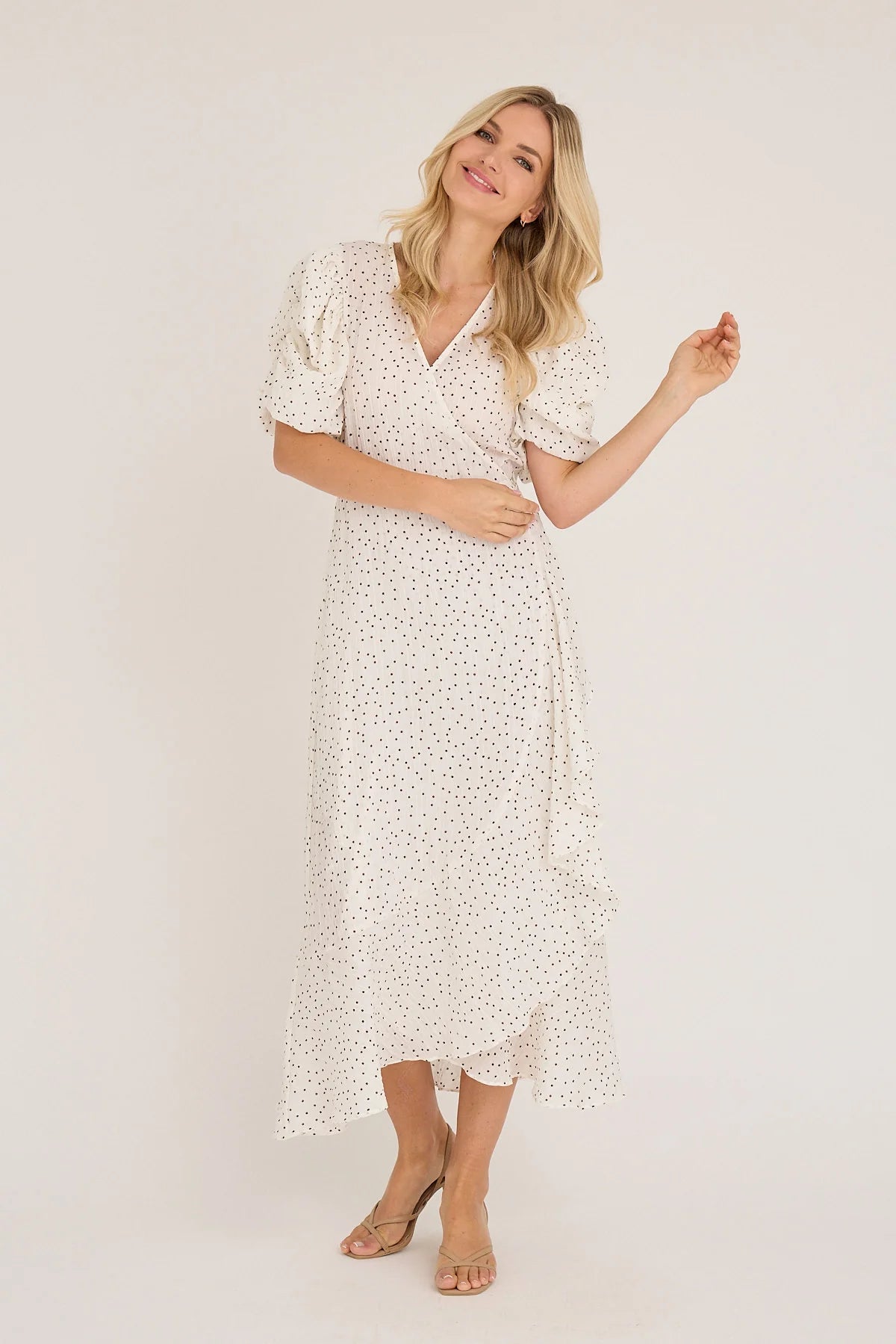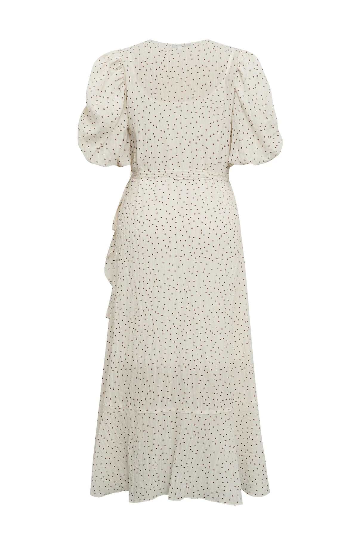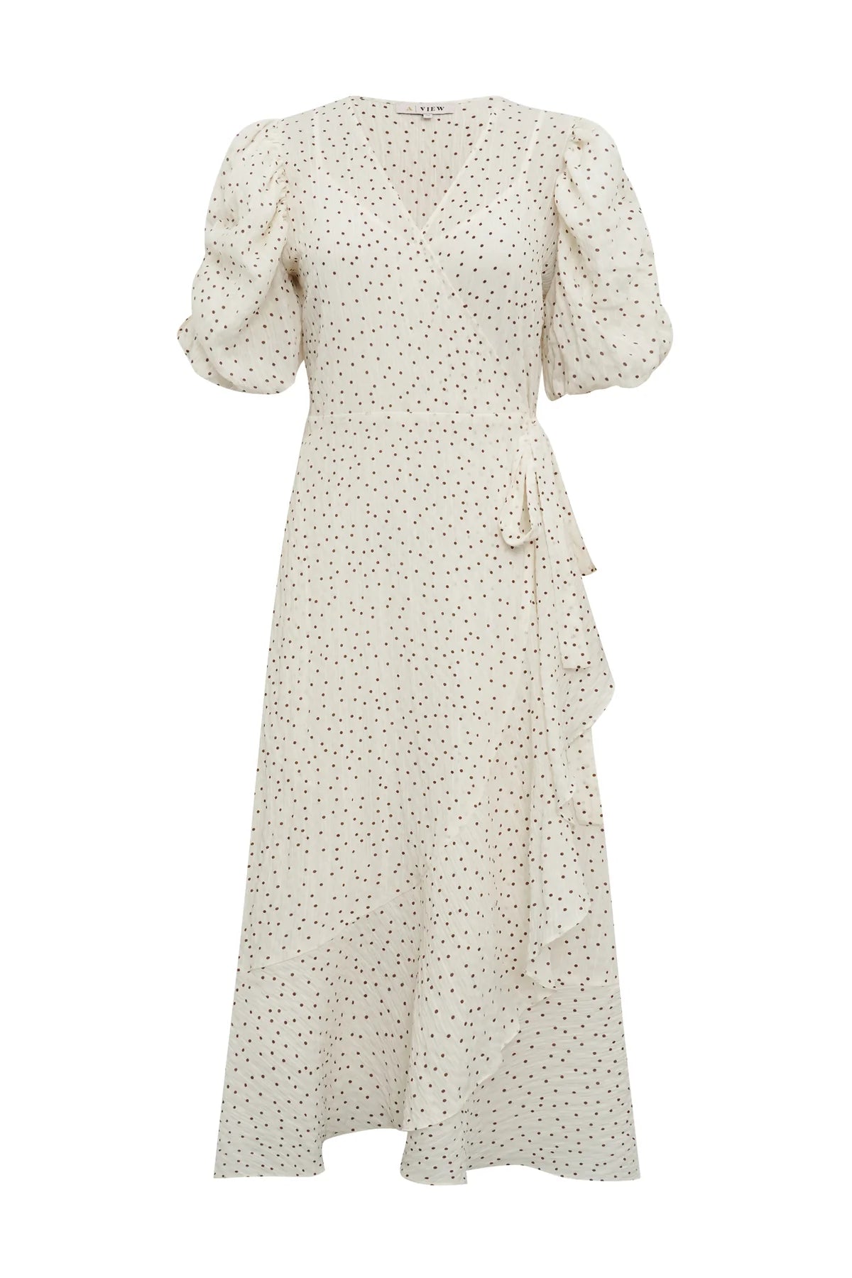 Kjole med omslag i kreppet kvalitet. Prikker og lett kvalitet.