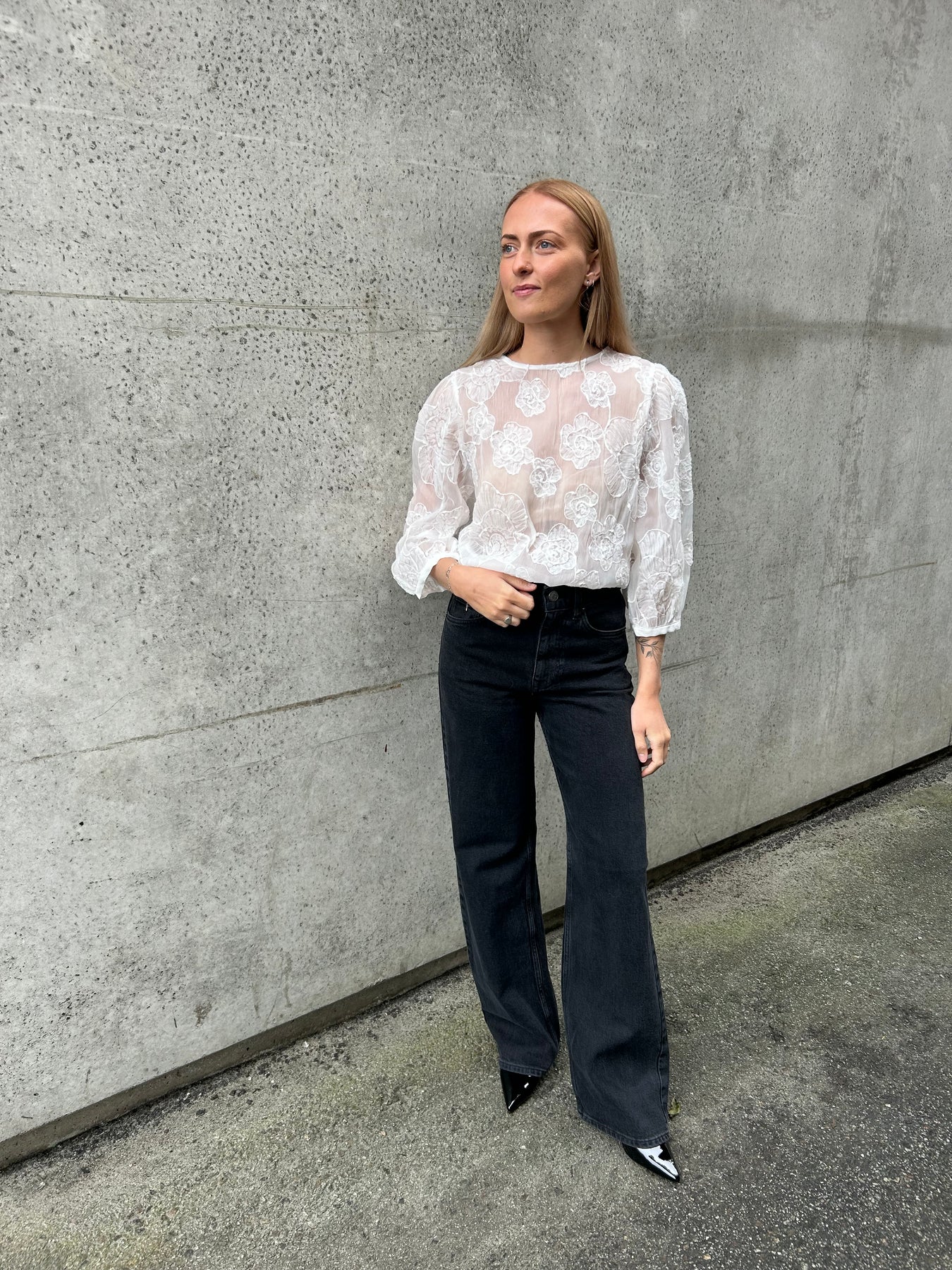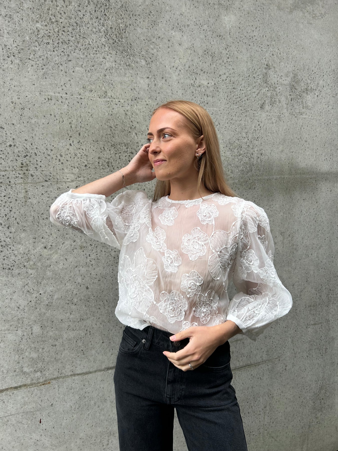 Hvit blondetopp med ballongermer. Kort og løs modell med klapping bak.