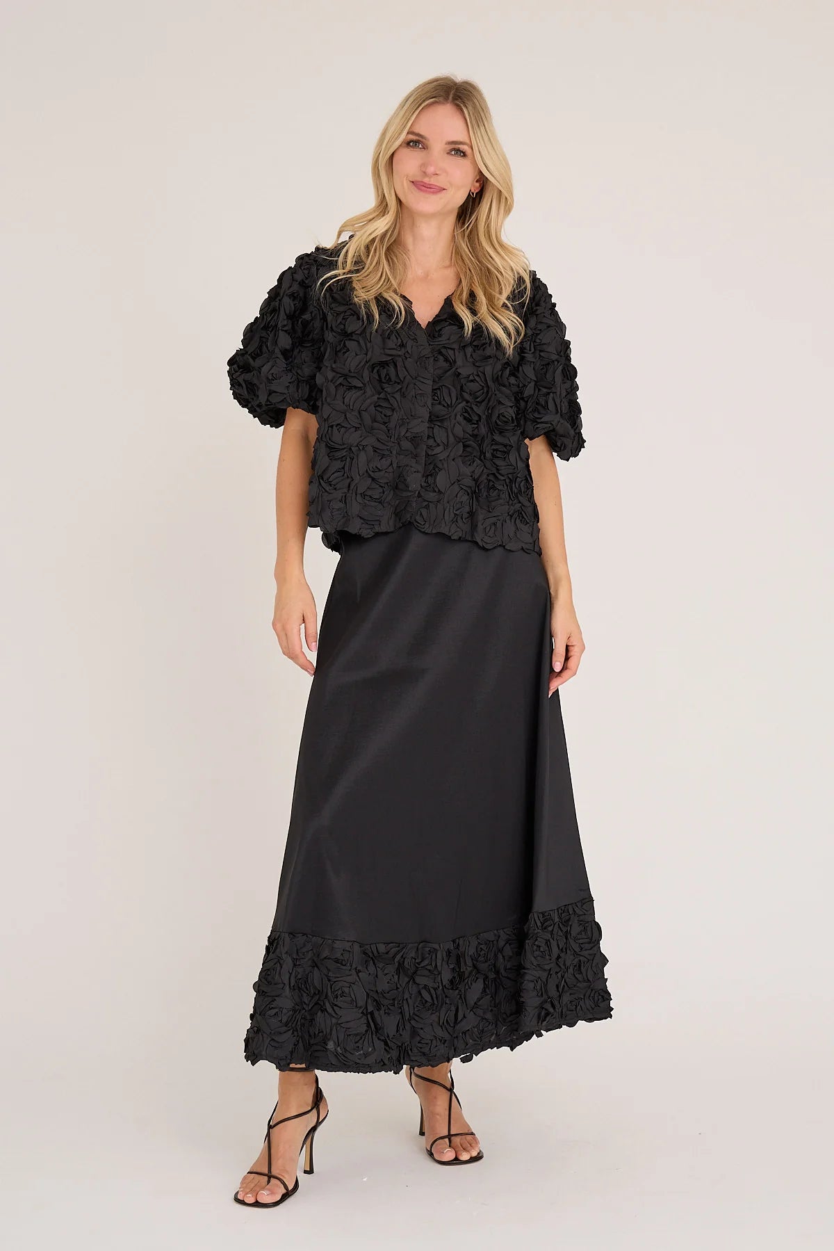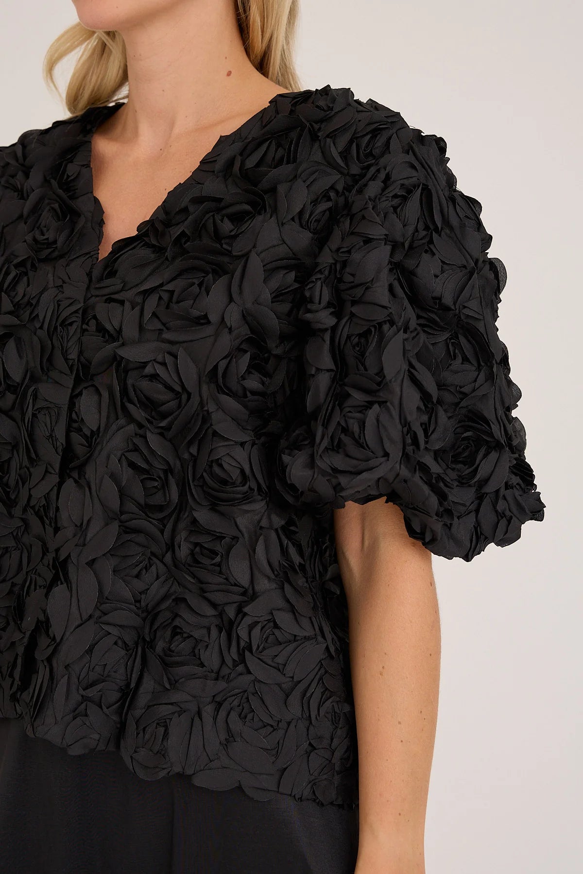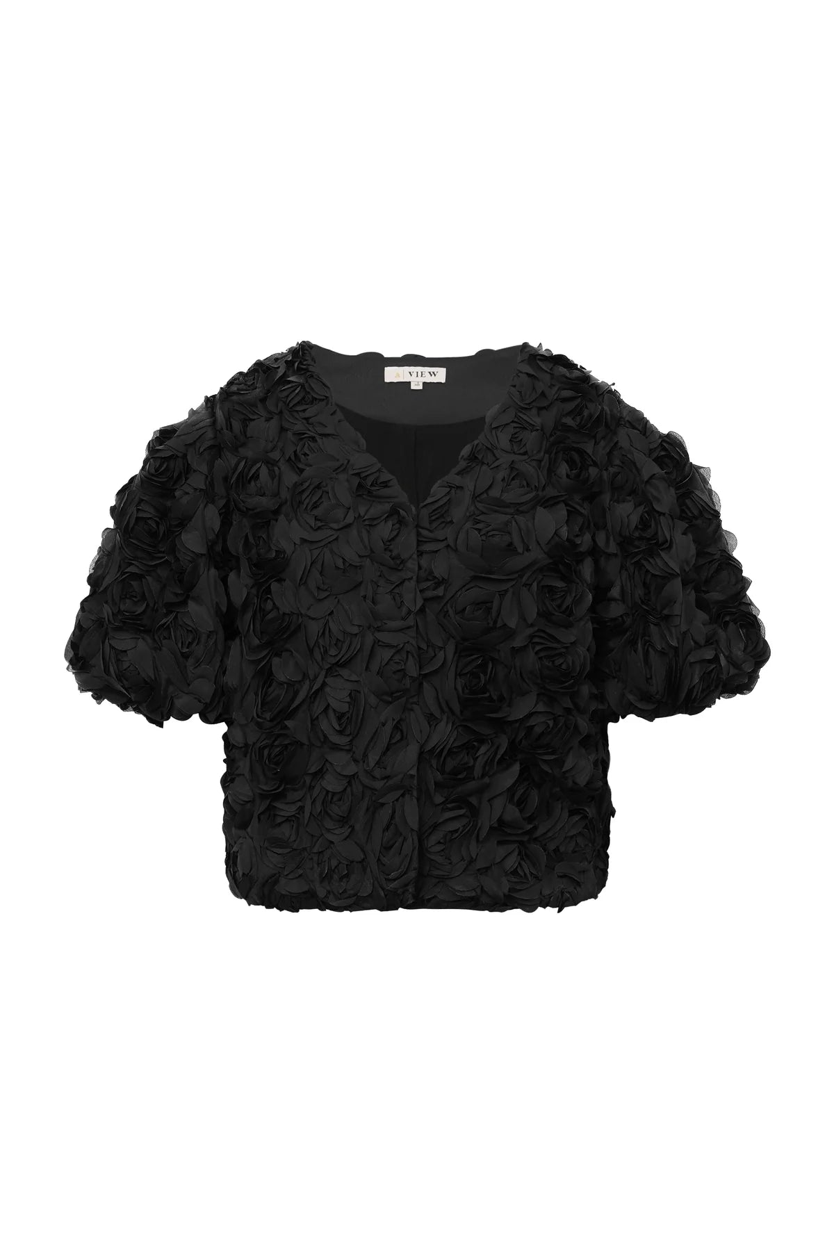 Lekker topp med 3D- dekor med blomster. Kan brukes som topp eller jakke. Har trykknapper og puffermer. Kan styles med hvit singlet inni med jeans og boots eller over en kjole. Litt stor i størrelsen