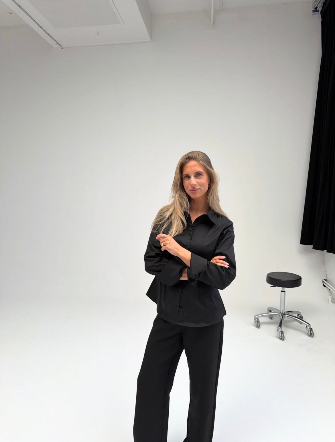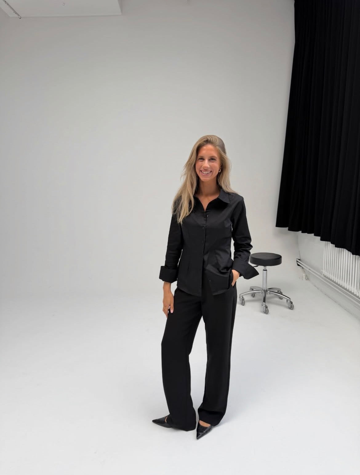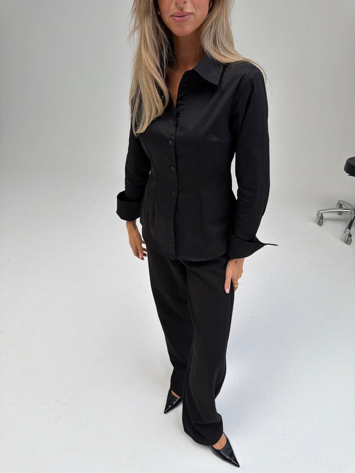 Klassisk svart skjorte med en moderne, feminin silhuett. Designet med en tettsittende midje og brede mansjetter, noe som gir et raffinert preg til den tidløse stilen. Den spisse kragen og knappelukkingen foran fullfører antrekket, noe som gjør den perfekt for både kontorbruk og uformelle kombinasjoner.