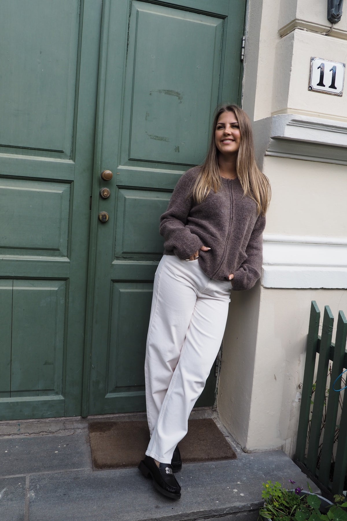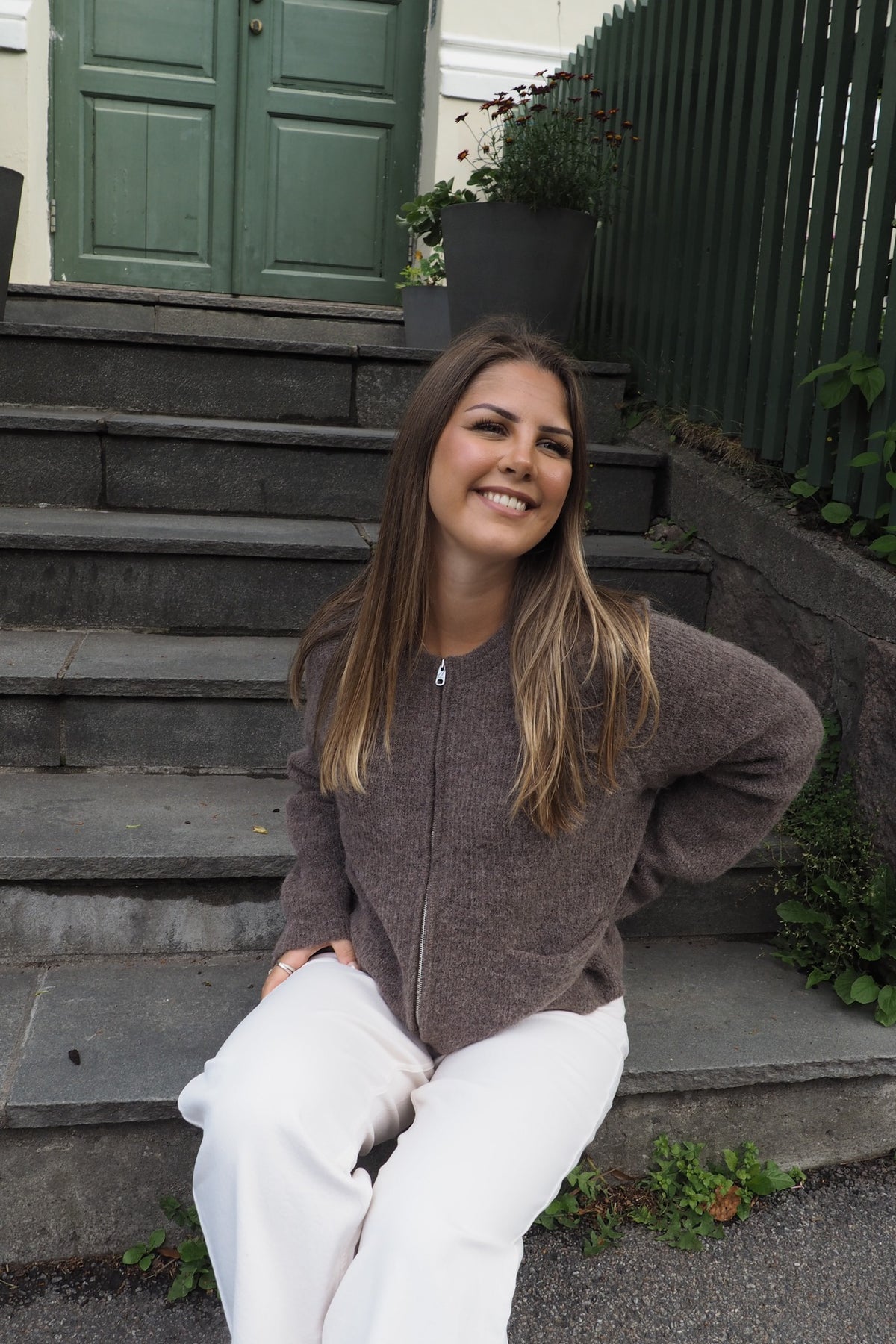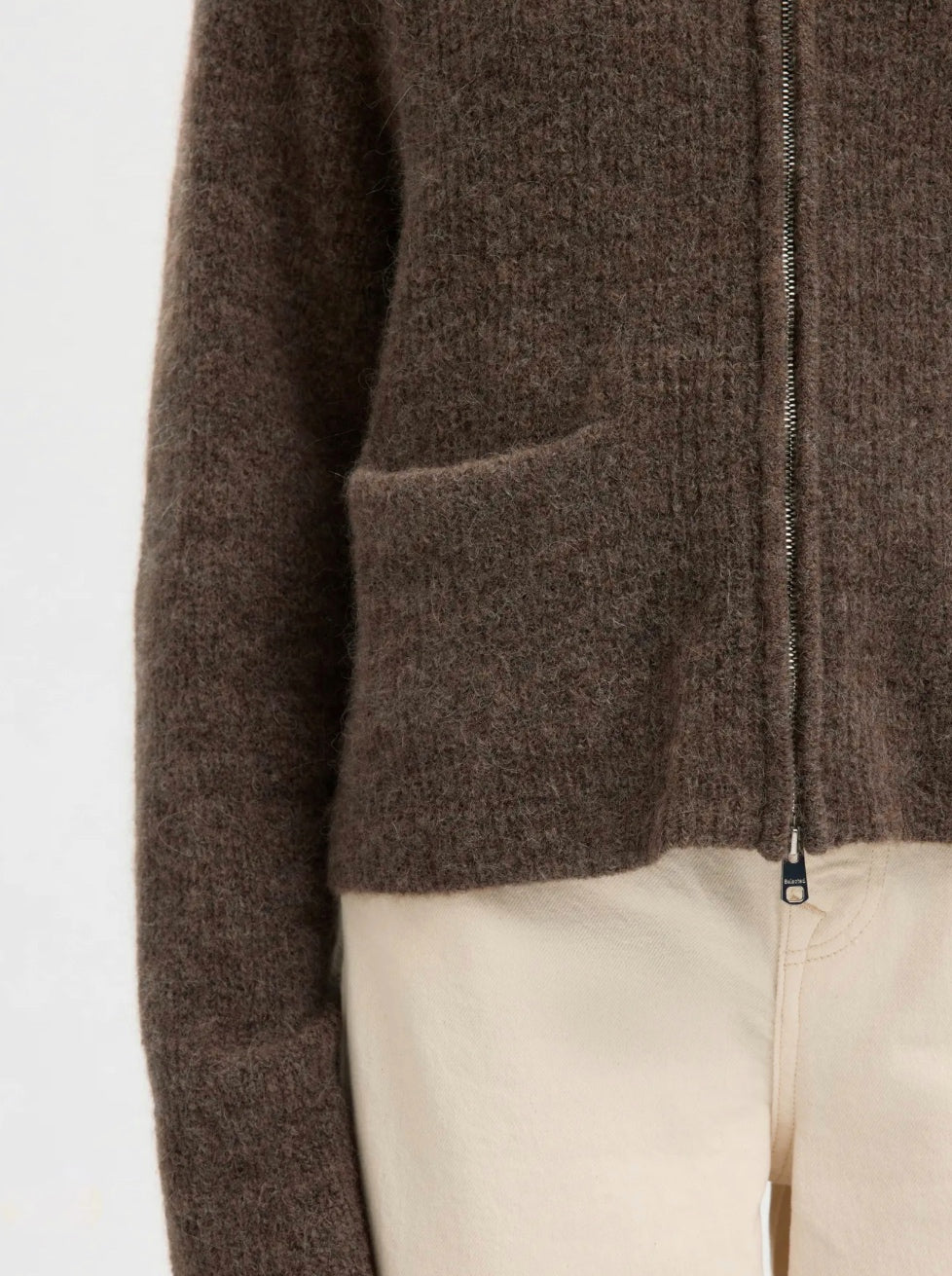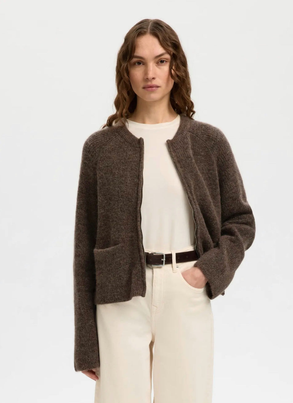 Deilig strikkejakke med glidelås, rund hals. Kort og boxy modell.