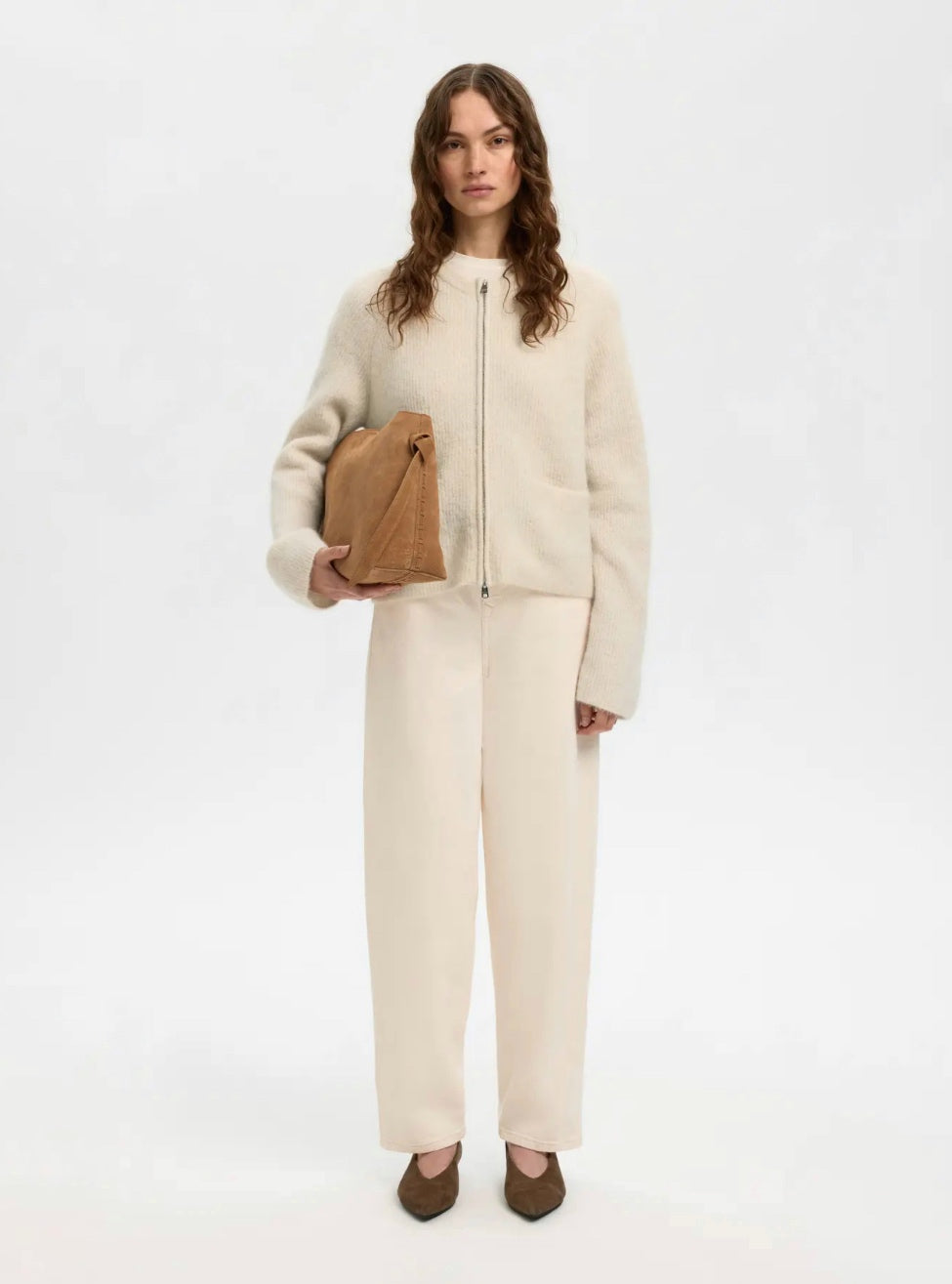 Deilig strikkejakke med glidelås, rund hals. Kort og boxy modell.
