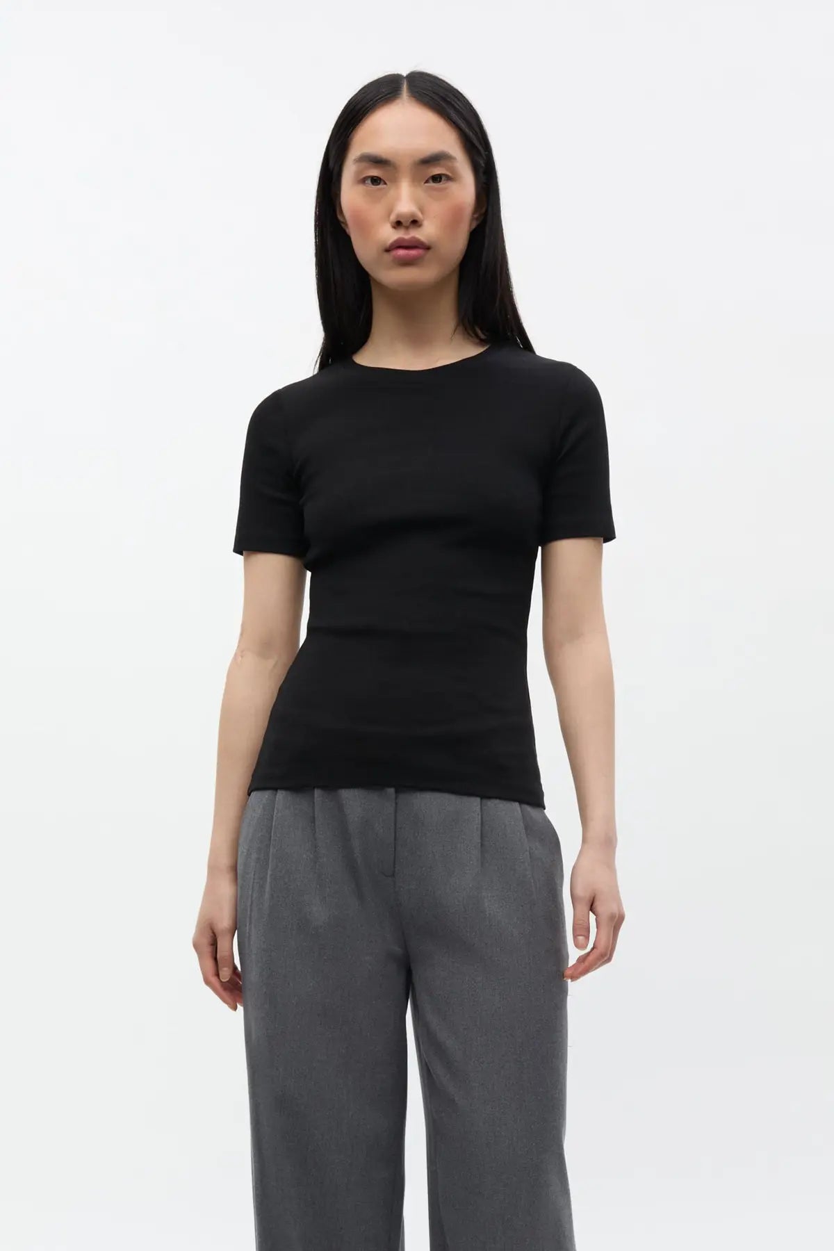 Kort t-skjorte i ribbestrikket kvalitet fra envii. Smal og ribbet kvalitet. Fin å bruke inni dressjakker og strikk. Rund hals.