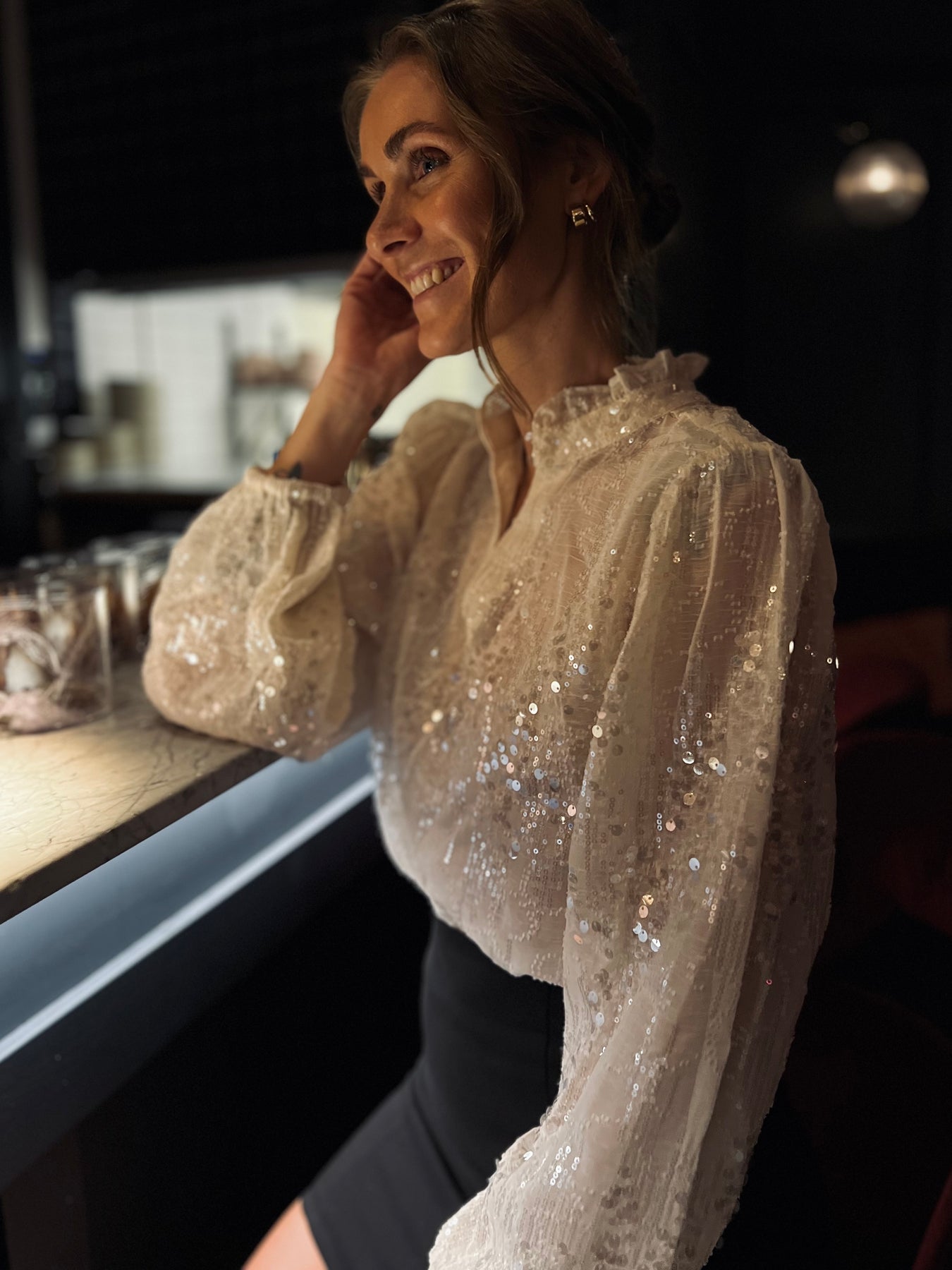 Paljettopp med v/hals og lange ermer. Fin å style til jeans, dressbukser og skjørt.