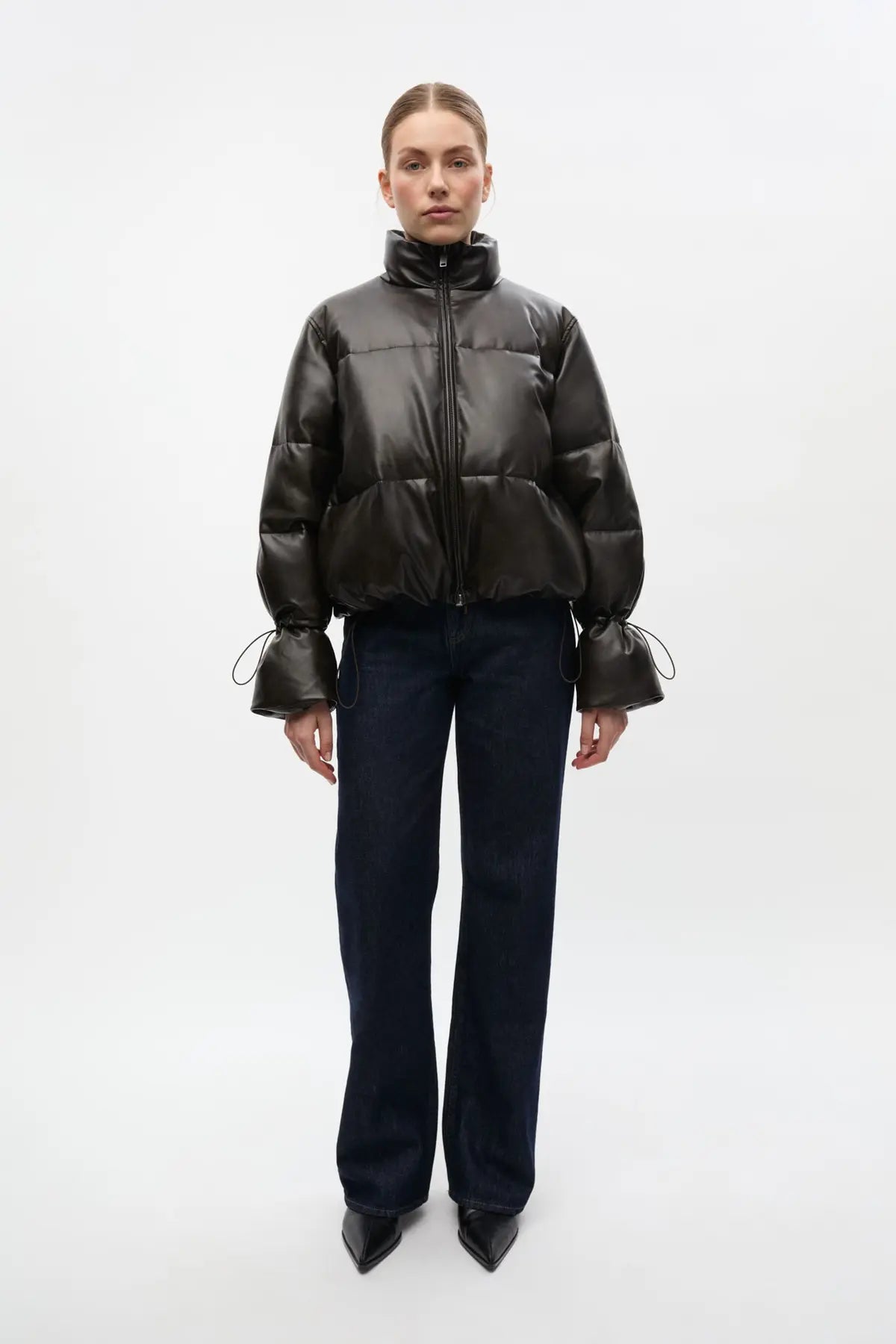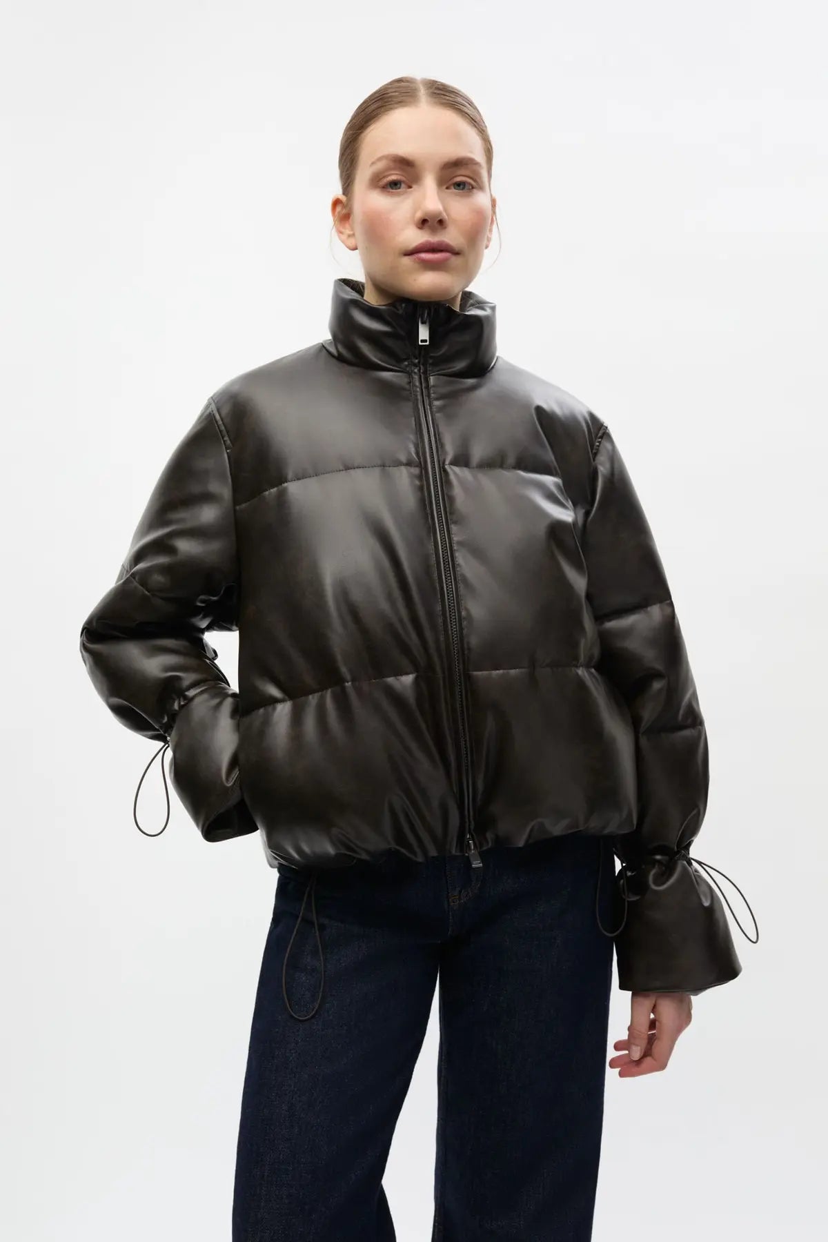 Rå boblejakke fra Envii. Vokset overflate. Kort og oversized modell. Innsnøring ved ermene.